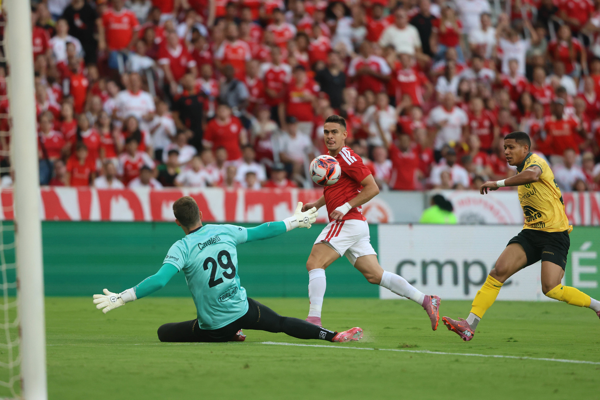 A partida começa num ritmo normal com a equipe visitante tomando mais a iniciativa já que estavam perdendo por 0 x 3 no placar agregrado. Aos 2 minutos, num lance pelo lado esquerdo de ataque, o meio-de-campo Colorado Alan Patrick alça a bola na área adversária onde após uma disputa de bola entre o meio-de-campo Colorado Ronaldo e o lateral-esquerdo Nicolas, ela sobra livre para o zagueiro Colorado Juninho que, completamente livre na pequena área, desperdiça uma chance incrível ao “furar” em bola e por isso a bola sai pela linha de fundo em tiro de meta para a equipe deles. Aos 4 minutos, numa falta pelo lado direito da intermediária de ataque, a bola é alçada na área Colorada onde o atacante Gustavo Simões, na entrada da pequena área, cabecea sem perigo por cima da nossa goleira. Aos 6 minutos, numa falta pelo lado direito de ataque, a bola é cruzada na área Colorada onde o zagueiro Walce, na frente da pequena área, cabecea com extremo perigo sendo que o goleiro Colorado Rouchet consegue defender parcialmente e consequentemente a bola toca no travessão da nossa meta, mas ainda assim a bola sobra para o lateral-direito Cleiton que, completamente livre na pequena área, cabecea e mais uma vez a bola toca no travessão sendo que na sequência do lance a defesa Colorada consegue afastar a bola para longe da área! Aos 7 minutos, num lance na intermediária de ataque, o meio-de-campo Colorado Bruno Gomes tabela com o meio-de-campo Colorado Alan Patrick sendo que este ao receber a bola de volta toca de primeira para o atacante Colorado Rafael Borré que, dentro da área deles pelo lado direito, chuta de primeira de pé direito para abrir o placar no estádio Gigante da Beira-Rio! 🙂 Aos 11 minutos, num lance de contra-ataque a partir do lado direito da intermediária do nosso campo de defesa, o centroavante Colorado João Victor arranca em alta velocidade com a bola dominada até a frente da área deles onde faz o passe para o atacante Colorado Rafael Borré que, na entrada da área pelo lado direito, cruza rasteiro para o meio da área onde o meio-de-campo Colorado Bruno Gomes. completamente livre, desperdiça uma ótima chance ao chutar fraco e rasteiro de pé esquerdo uma bola que é defendida com certa facilidade pelo goleiro Gabriel. Aos 15 minutos, numa cobrança de escanteio pelo lado direito, a bola é cruzada na área deles onde após o rebote ela sobra para o meio-de-campo Colorado Allex que, na entrada da área pelo lado esquerdo, chuta forte de primeira de pé esquerdo obrigando o goleiro Gabriel a fazer uma linda defesa espalmando a bola sendo que na sequência a defesa adversária afasta ela para longe da área. Aos 21 minutos, num lance pelo lado esquerdo de ataque na frente da área adversária, o meio-de-campo Colorado Alan Patrick recebe o passe e toca a bola para o lateral-esquerdo Colorado Bernabéi que, dentro da área pelo lado esquerdo, domina e chuta forte e rasteiro de pé esquerdo obrigando o goleiro Gabriel a fazer uma defesa espetacular espalmando a bola pela linha de fundo com escanetio a nosso favor. Aos 24 minutos, num lance na intermediária de ataque, o meio-de-campo Colorado Ronaldo recupera a posse de bola e toca rápidamente para o meio-de-campo Colorado Alan Patrick que, mais à frente, faz o passe para o atacante Colorado Rafael Borré que entra na área deles e chuta forte de pé direito obrigando o goleiro Gabriel a fazer outra defesa espetacular espalmando a bola para fora da área. Aos 30 minutos, num lance pelo lado esquerdo de ataque, o meio-de-campo Colorado Allex cruza rasteiro no meio da área deles onde o meio-de-campo Colorado Alan Patrick toca de primeira para o centroavante Colorado João Victor que, completamente livre pelo lado direito, chuta rasteiro de pé direito obrigando o goleiro Gabriel a fazer mais defesa espetacular espalmando a bola sendo que na sequência a defesa adversária consegue afastar para longe da área. Aos 31 minutos, num lance pelo lado esquerdo de ataque, o meio-de-campo Colorado Allex recebe a bola e passa para o lateral-esquerdo Colorado Bernabéi que, dentro da área deles, domina com o pé direito e chuta forte com o pé esquerdo obrigando o goleiro Gabriel a espalmar a bola sendo que no rebote ela sobra para o meio-de-campo Colorado Ronaldo que, completamente livre na frente da pequena área, desperdiça uma chance incrível ao chutar de pé direito por cima da goleira deles. Aos 39 minutos, numa ótima troca de passes entre os jogadores Colorados, o lateral-direito Colorado Braian Aguirre recebe a bola na frente da área adversária e chuta rasteiro de pé direito uma bola que passa relativamente perto da trave direita da meta deles e sai pela linha de fundo. Aos 41 minutos, num lance na frente da área deles, o meio-de-campo Colorado Bruno Gomes consegue desarmar a defesa adversária e entra na área pelo lado direito onde rente à linha de fundo recua a bola para o centroavante Colorado João Victor que, também dentro da área, recua também a bola para o meio-de-campo Colorado Ronaldo que, na frente da área, chuta forte e rasteiro de pé direito obrigando o goleiro Gabriel a fazer outra defesa espetacular espalmando a bola pela linha de fundo com mais um escanteio a nosso favor. No minuto seguinte, na cobrança de escanteio pelo lado direito, a bola é cruzada na área deles onde após o rebote ela sobra para meio-de-campo Colorado Allex que, dentro da área pelo lado esquerdo, chuta rasteiro de pé esquerdo uma bola que sai pela linha de fundo passando muito perto da trave direita da goleira adversária e tocando na rede pelo lado de fora. Aos 46 minutos, numa falta pelo lado esquerdo de ataque, a bola é cruzada na área Colorada sendo que o atacante Gustavo Simões desvia de cabeça para o lado direito da área onde o meio-de-campo Igor Silva ao tentar cruzar na pequena área faz com que a bola desvie no meio-de-campo Colorado Bruno Gomes e toque no travessão da nossa goleira o
